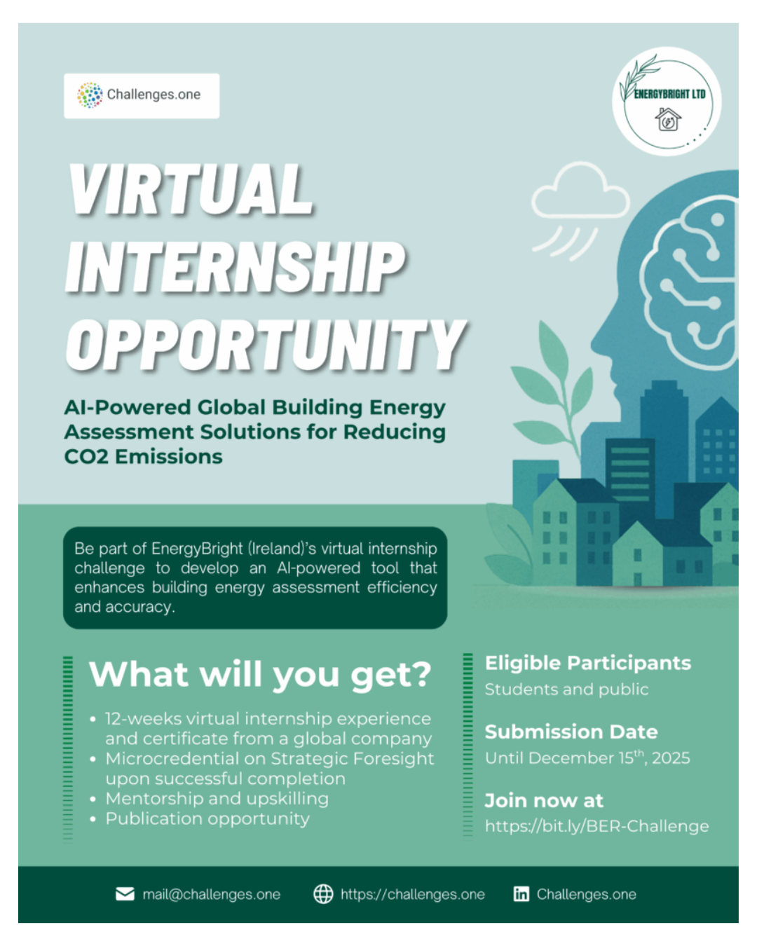 With over 250 million buildings worldwide requiring energy assessments, and current processes taking 1 to 6 weeks, depending on the jurisdiction, this challenge from EnergyBright (Ireland) seeks innovative AI-driven solutions to boost efficiency, accuracy, and speed. The aim is to cut assessment times to less than 24 hours while ensuring compliance with international regulations.