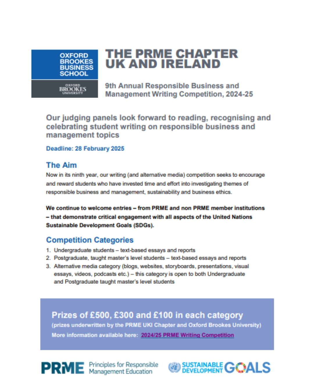 Entries are invited on a broad range of topics related to responsible business, management and leadership themes and consistent with PRME’s support for the UN Sustainable Development Goals. An indicative but not exclusive list of possible topic areas includes: business ethics, CSR, environmental economics, social business models, social and environmental accounting, green supply chains, responsible marketing, sustainable HRM and responsible management education.